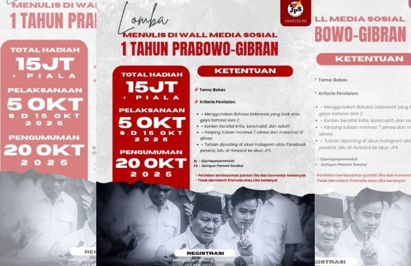 UtusanIndo.com, Padang, – Dalam rangka memperingati satu tahun kepemimpinan Presiden Prabowo Subianto dan Wakil Presiden Gibran Rakabuming Raka, Jaringan Pemred Sumbar (JPS) Institute menggelar lomba menulis di media sosial (medsos).